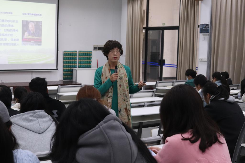 王菁华教授以“幸福之问”为切入点徐徐展开,与同学们探讨幸福的定义,并引出了“灵性幸福”这一话题,她解释道:“灵性幸福”是建立在物质基础之上的有着崇高精神追求和道德正义的幸福,它的核心为“智”、“情”、“德”,即自由求真的头脑、丰富崇美的心灵、高贵向善的灵魂。