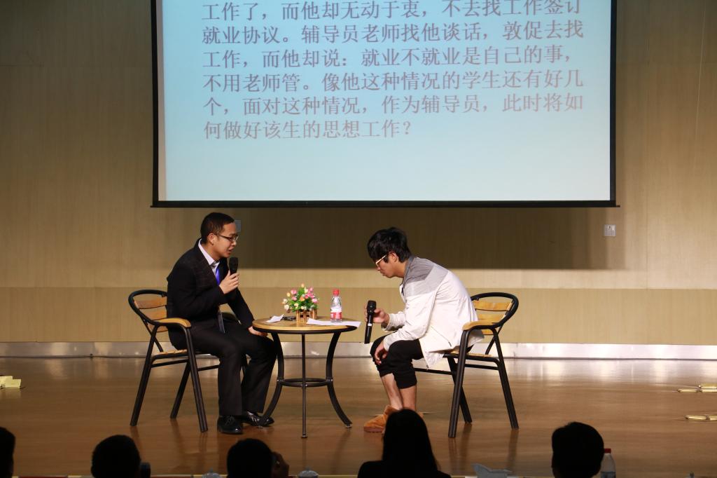 决赛分为案例分析、主题演讲、谈心谈话情景再现三个环节。案例分析比赛中,辅导员根据题目求,从案例背景、问题关键点、解决思路、实施办法、经验启示等5个方面进行分析阐述,主要考察辅导员分析判断和解决问题的能力。主题演讲比赛主要考察辅导员语言表达能力和逻辑思维水平。谈心谈话比赛中,辅导员根据题目要求,以情景再现的方式开展谈心谈话,由模拟学生进行简单配合,主要考察辅导员对相关知识的运用能力以及沟通技巧。比赛中,各参赛辅导员分别与问题学生进行沟通交流,开导他们,解决问题。尽管学生百般刁难,但辅导员老师们勇敢面对,机智化解,将比赛推向高潮。此时的现场不仅是一场比赛,更是辅导员们展现日常工作方法、工作态度的实践平台。