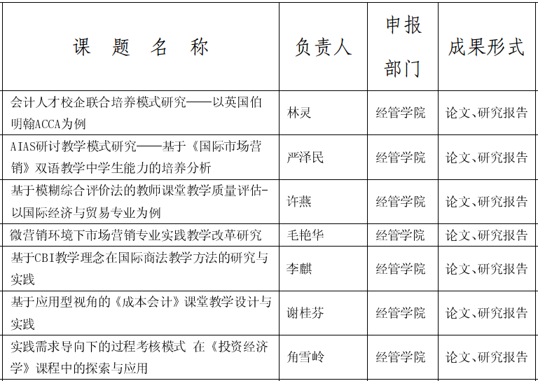 经教职工申报,专家组评审,校长办公会议通过,我校34 项课题列为学校 2015 年高教研究课题,英国上市公司365林灵、严泽民、许燕、毛艳华、李麒、谢桂芬、角雪岭7位老师所报课题名列其中。