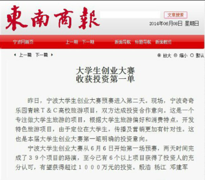 6月8日,从正在进行中的宁波市创业大赛组委会和市各大媒体传出喜讯,由公司大学生孙露恩、王飞飞、余鹏等组成的学生创业团队申报的“T&C高校旅游开发项目”在宁波市创业大赛中与企业达成投资意向。据介绍,这也是本届宁波市大学生创业大赛第一笔明确的投资意向。