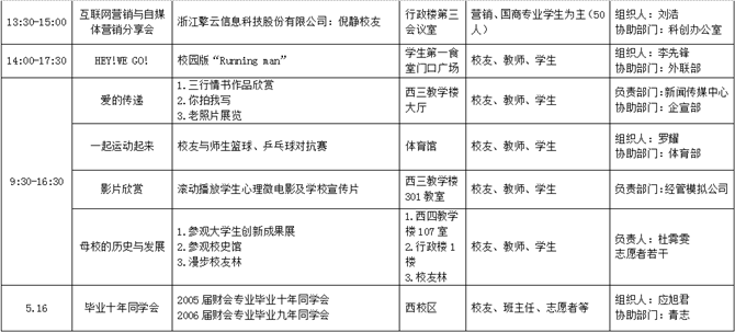 根据学院年初工作安排,为更好地提升两个满意度,加强与校友的联络交流,确定从今年起以后每年5月份的第二个星期六定为校园开放日,即今年的校园开放日为5月9日。开放日当天,学院组织了丰富多彩的活动,请全体教职工和同学们能积极参加。教师报名参加的活动项目请报给各系,学生报名参加的活动项目请各年级辅导员做好统计。