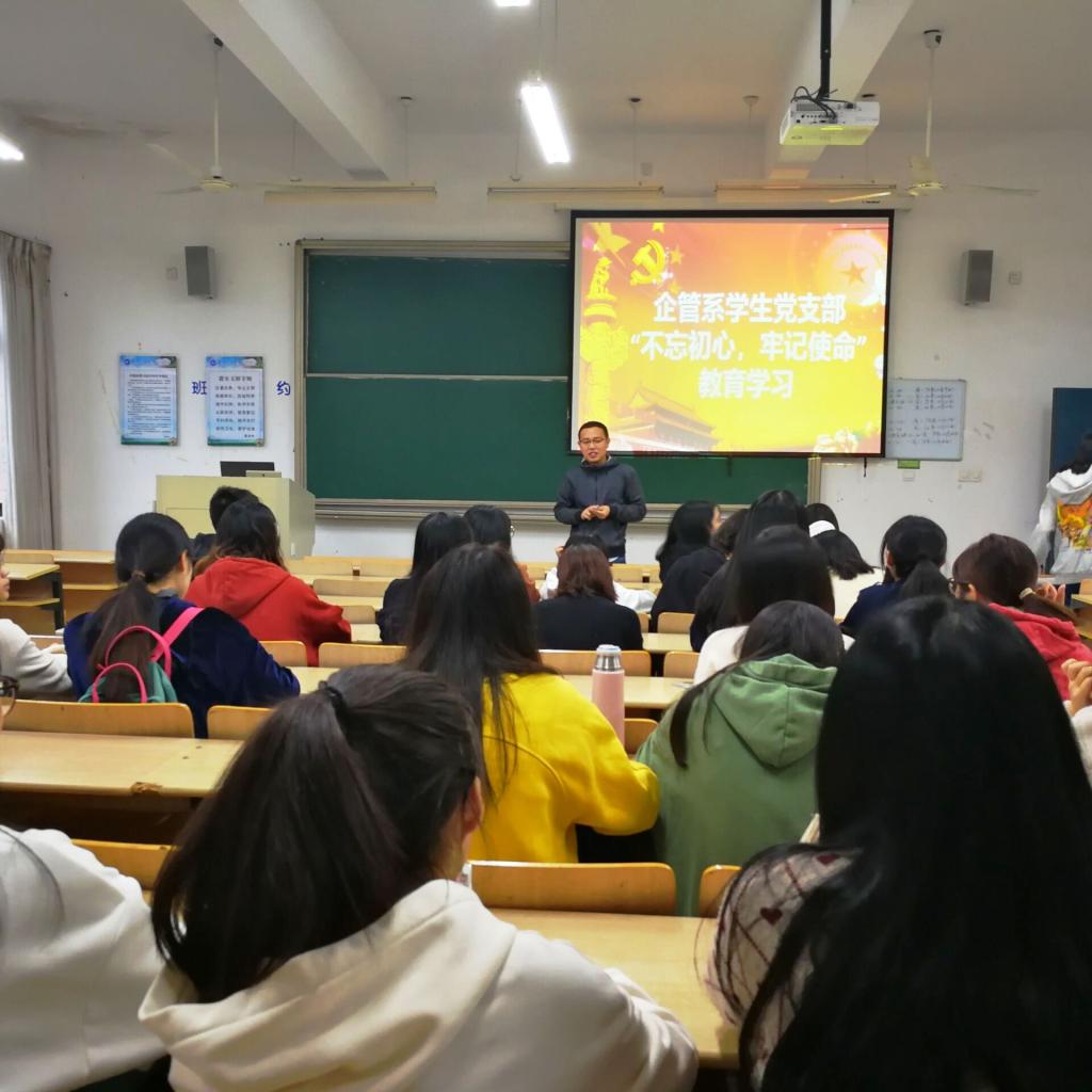 校园新闻网讯 10月28日,企管系全体积极分子在西三307进行“不忘初心牢记使命”主题教育党课,党课由企管系学生党支部书记李先锋主讲。