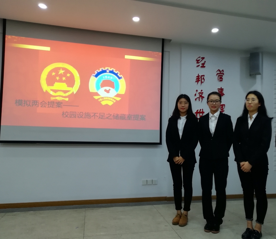 此次“两会模拟”围绕“心系校园,提升满意”这一主题展开。各组成员从维护学生利益、提升学生满意的角度出发,通过调研分析,提出了一系列具有针对性、操作性的提案,并通过PPT的形式展示汇报。如《关于校选课的设置问题》、《图书馆如何提高座位使用率》、《关于开放校园驿站的建议》等提案引起了不少的共鸣。这些提案中,有成熟的,也有不完善的,三位评委分别根据各个小组的实际情况,给予了有针对性的意见和建议。最终,《拒绝“牛皮癣”》、《校园设施不足之储藏室提案》、《校园多爱我一点》等三组提案分别被评选为一、二、三等奖。