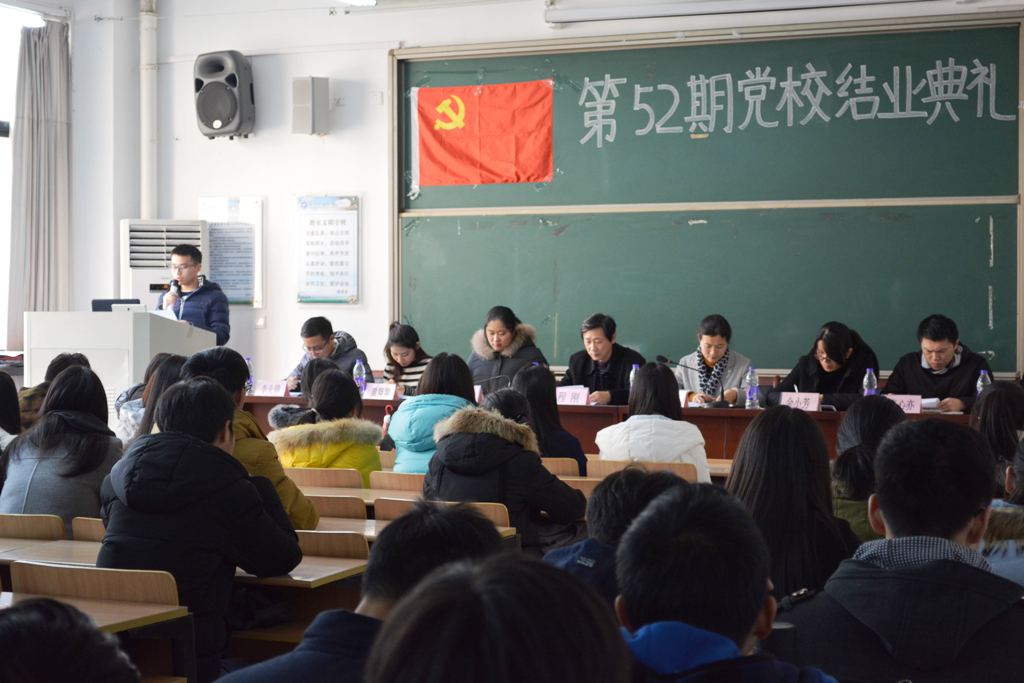 结业典礼在雄壮的国歌声中拉开序幕。周丽娜宣读优秀学员名单,并为八位优秀学员颁发证书。国商161班优秀学员代表发言,他承诺将与时俱进,学心态,学方法,提高自己的实际能力向党组织靠拢。党课班主任李先锋作结业报告。他对党校学员的学习情况做出总结,学员们做到了心中有知识、心中有纪律的要求,88名学员通过了考试,顺利结业。