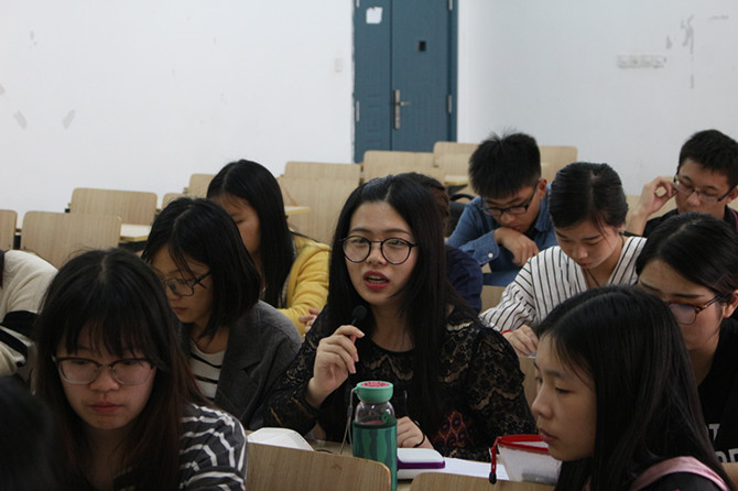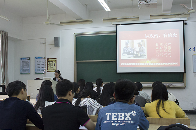 来自会计系学生党支部的舒望婷、张铭、蒋鑫丽和黄娟丽四名党员同学就“讲政治,有信念”的四个指向——“牢固增强和树立四个意识”、“要把好总开关,补足精神上的钙”、“党性教育是共产党人的心学”以及“牢固树立宗旨观念”进行了详细的解读。黄娟丽用“路上有他人扔的垃圾,作为党员同学看到去不去捡起来扔进垃圾桶”的讨论直接地阐述了党性宗旨的重要性。