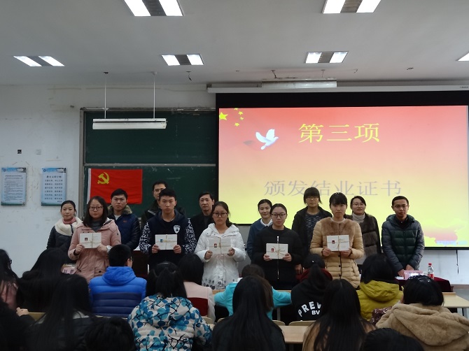 结业典礼在雄壮的国际歌歌声中开幕。周书记宣读优秀学员名单,并为其颁发优秀学员证书。优秀学员代表会计144班陈俊发言,他强调将严格要求自己,努力学习,提升自我,以不断向党组织靠拢。赵静老师作工作总结报告,她对学员们一学期的党校学习做了总结,也对学员今后的学习和生活提出了希望。程书记做大会总结。他首先祝贺全体学员培训结束,向授课老师表达衷心的感谢。积极分子是党员发展的后备力量,为此他向全体入党积极分子提出三点要求:第一,要加强政治理论学习,坚定理想信念,学习党的基本知识,努力在思想上向党靠近;第二,提高自己,积极开展工作,不断提高自己的实践能力和创新能力,高度注意自己的能力培养;第三,积极发挥先锋模范作用,成为学生的骨干、核心,以党员的标准严格要求自己。