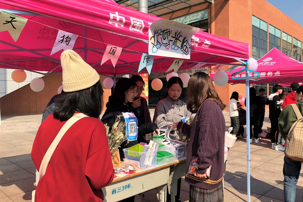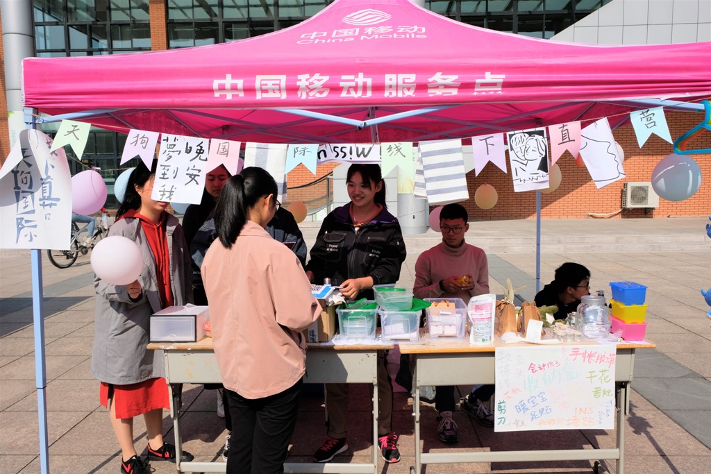 各班队伍10月9日中午开始了第一天的销售,现场人声鼎沸、门庭若市,各个摊位有不同的主打销售产品和特殊门店装修风格。在第二天,有些班级利用促销活动进行了新一波宣传推广,甚至有一些摊位改变了经营方式,运用套圈等娱乐的形式招徕顾客。