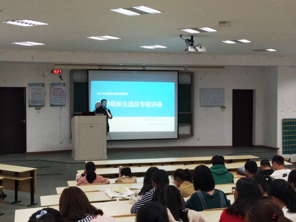 讲座开始,两位老师阐述了举办该讲座的目的和意义,旨在引导新生顺利完成大学入学适应,预防各类因适应困难出现心理问题。而后,两位老师从气候适应、环境适应、对自己的适应、对老师的适应、对室友的适应等多方面分类讲解,把大一新生入学可能遇到的各种适应困难做了讲解。为了使新生更好的适应大学生活,老师给出了一些建议,包括调整任职、及时沟通、求助老师等措施。