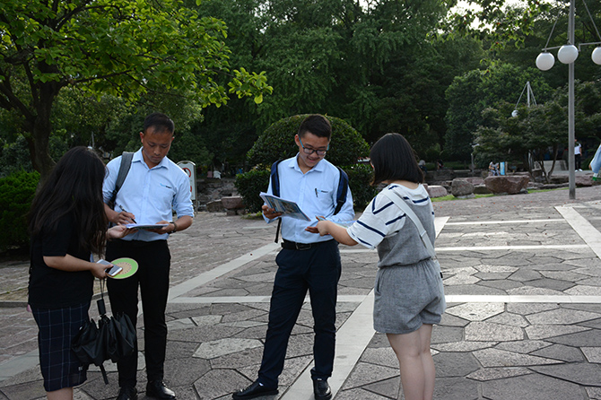 随后,各个成员奔波在人群中发放问卷,在看到行人停下脚步并热情地接过问卷认真填写时,成员们喜形于色。在烈日下发问卷实属不易之事,但是每个人都认真负责地完成了自己所分配到的任务。发问卷的过程并不轻松,也遭到过拒绝,但是她们依旧以笑容回报每一个行人,让行人感受到她们的真诚。