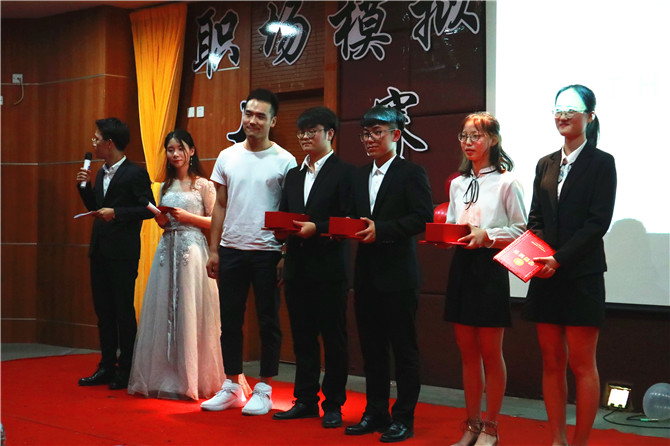 第二环节职场大闯关中,每位选手抽取一个题目进行作答,他们答题思路清晰、观点明确,对抽取的题目进行了精准的分析和讲解。评分前四的同学进入了最后的超级推销员环节,他们随机抽取物品进行现场推销。经过角逐,最终营销171张泽获得第一名,营销172吴登鹏、数据工程174胡月分获二、三名。