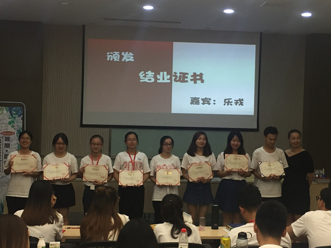 午饭后不久,学员们进行了各队节目表演和最受欢迎同学、团队的评比。老师还为学员准备了照片环节,PPT上滚动的照片都是学员们这七天来的记录,记录了每个人的成长,这也是学员们青春的纪念册。王老师在总结这七天时,给大二大三的同学们寄予了美好祝愿,同时还以自己在公司成长的经历鼓励同学们要有锲而不舍和百折不挠的精神。随后,楼老师为每个学员都颁发了结业证书,在快要离开的时候,王老师进行了最后一次点名,在报完最后一位学员的名字后,温柔的喊出,你们毕业啦。