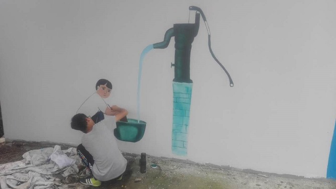 雨后的前童清凉异常,但火热的太阳又在午后开始了新一轮的炙烤,空气中是似乎凝固后挥之不去的闷热感,墙绘组的队员们继续前几日的工作,将前童古镇的部分墙壁、电线杆进行涂鸦,在室外作业的他们经历了一天的工作已然晒黑甚至晒伤了不少,豆大的汗水从脸颊流下也来不及去擦,但他们依旧怀着强烈的责任心在恶劣的工作环境下坚持着。同时也有部分同学仍坚守着原先的岗位,他们明白剩余的时间已经屈指可数,所以也越发珍惜这转瞬即逝的几日。