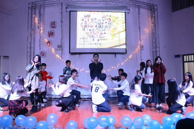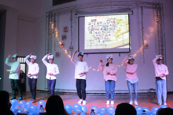 走进小剧场,门口是由荧光棒连接而成的道路,闪着或深或浅的光,温馨而静谧。小剧场内到处挂满蓝色的气球,淡黄色温暖的光打在舞台上,新生们就在这样温暖的场景里用歌声,用舞蹈来表达他们的感情。