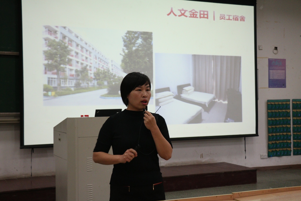校园新闻网讯  10月12日下午,教四110里人声鼎沸,中国500强企业金田铜业宣讲会在这里举行。金田铜业人力资源部经理符艳担任了此次宣讲会的主讲人。