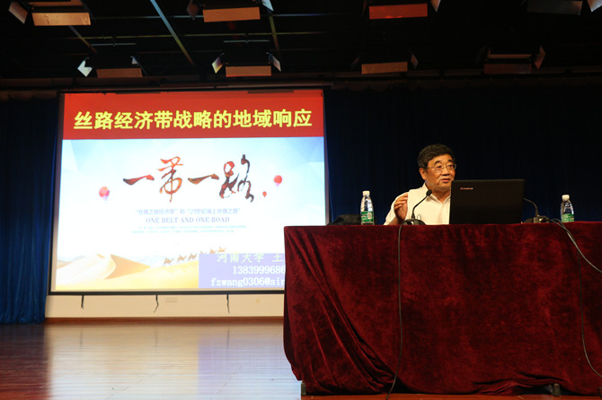 校园新闻讯 9月26日下午,英国上市公司365经济大讲堂--“丝路经济带战略的地域响应”在图书馆阳明报告厅举行。讲座由副院长唐新贵主持,河南大学教授王发曾主讲。13、14、15级学生和部分老师参加讲座。
