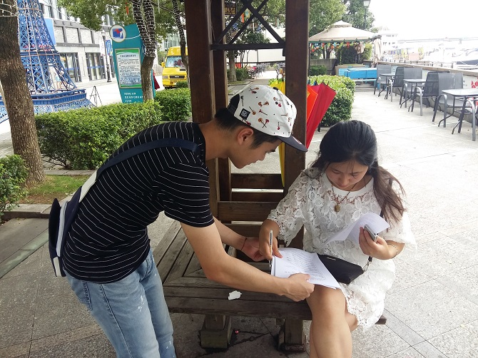 活动期间,实践小组一起出发。达到目的后,两人一组进行调研。顶着炎炎烈日,成员们真诚的向市民或是游客发出邀请,希望他们能够通过问卷反馈自己的意见,并耐心的为游客讲解有疑惑的地方。不时有当地居民向成员们吐露自己对滨水景观设计的心声,还有热心的居民指出了具体的不满意之处,这让我们了解到了滨水景观设计的一些地方仍有待进一步提高,取得成果的成员们感到很开心。成员们认真的态度赢得了当地游客的好评,成员们也为自己有机会调研感到很荣幸。