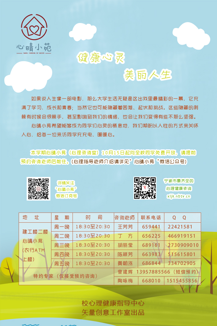 本学期心晴小苑(心理咨询室)10月15日起向全校同学免费开放,请提前预约咨询老师后前往。