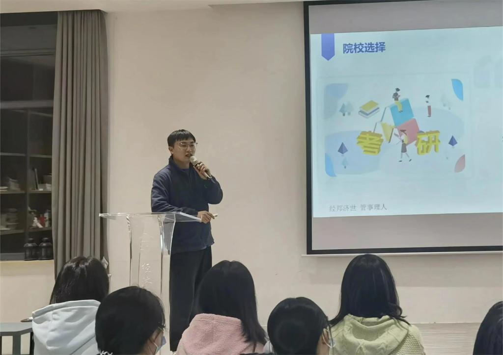 李凯磊从院校选择、初试经验、备考相关安排、复试经验四个方面与在场的学生展开了讨论与交流。针对院校选择,李凯磊鼓励学生要结合院校特点、自身学习能力、地区与城市来考量,也鼓励学生多多参看中国研究生招生网和心仪院校网站。讲到初试经验,李凯磊老师详细介绍了备考的五个阶段,并针对数学、英语、政治和专业课四门课程的备考进行了经验分享,同时他特别强调了考研方法和策略的重要性。关于复试,李凯磊就复试的基本原则、复试时需要注意的仪表仪态等也展开了详细阐述。讲座结束,来自经贸系学生党支部的入党积极分子陈姿颖谈到,之前想过考研,但是十分迷茫。她听完李凯磊的讲座后,对考研有了清晰的规划思路,李老师的讲座仿佛一盏明灯,点亮了我们前行的道路。